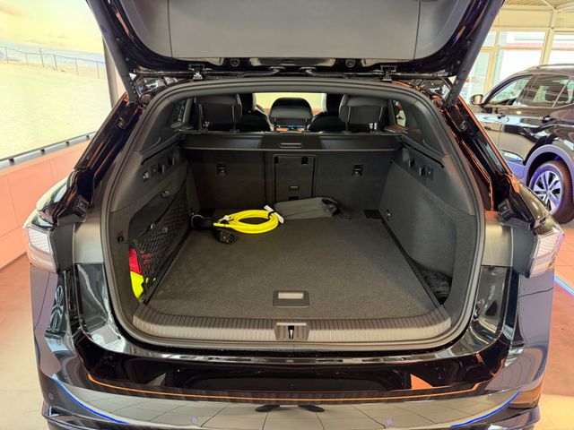 Airbag Fahrer-/Beifahrerseite, Beifahrerairbag abschaltbar, Akustischer Fußgängerschutz, Außensound (e-sound), App-Connect Wireless (Apple CarPlay, Android Auto), Audiosystem: Radio, Außenspiegel asphärisch, links und konvex, rechts, Außenspiegel elektr. verstell-, heiz- und anklappbar mit Spiegelabsenkung rechts, Außenspiegel mit Umfeldleuchte und Projektionsfunktion, Außenspiegel schwarz lackiert, Bordwerkzeug, Dachreling schwarz, Diebstahl-Warnanlage (Innenraumüberwachung, Back-up-Horn, Abschleppschutz), Diebstahlsicherung für Räder (Felgenschlösser), Elektromotor 210 kW (EDFB), Fahrassistenz-System: Abbiegebremsfunktion und Ausweichunterstützung, Fahrassistenz-System: Ablenkungs- und Müdigkeitserkennung, Fahrassistenz-System: Fahrprofilauswahl, Fahrassistenz-System: Notbremsassistent Front assist mit Fußgänger- und Fahrraderkennung, Fahrassistenz-System: Spurwechselassistent (Side Assist) mit Auspark-Assistent und Ausstiegswarnung, Fahrassistenz-System: Verkehrszeichenerkennung, Fernentriegelung Heckklappe, Frontkamera (Multifunktionskamera Frontscheibe), Fußmatten Textil, Gepäckraum-Abtrennung (Netztrennwand), Gepäckraumboden höhenverstellbar, Getriebe für Elektrofahrzeug, Head-up-Display mit Augmented Reality, HV-Batterie 82 kWh brutto / 77 kWh netto, Innenspiegel mit Abblendautomatik, Insassen-Schutzsystem proaktiv, Isofix-Aufnahmen für Kindersitz an Beifahrersitz und Rücksitz (inkl. i-Size-Kindersitze), Karosserie: 5-türig, Kopfstützen hinten (3-fach), Ladekabel mit Typ 2-Stecker (Mode 3, 16 A), Ladeleistung HV-Batterie 11 kW (Wechselstrom AC), Lautsprecher (9), LM-Felgen, Maximale DC-Ladeleistung (Gleichstrom) abhängig von der Anriebsbatterie, Multimedia-Schnittstelle 2 x USB (Typ C) vorn und 2 x USB-Ladeanschluß (Typ C) Mittelkonsole hinten (45 W), Notrufsystem, Pedale Edelstahl, Radioempfang digital (DAB+), Reifenkontroll-Anzeige, Rücksitzlehne geteilt mit Mittelarmlehne und Durchladeeinrichtung, Schließ-/Startsystem Keyless Access mit Safesicherung, Schnellladevorrichtung (CCS-Ladedose), Schriftzug auf der Gepäckraumklappe, weiß, Service-System: Intelligente Fahrzeugvernetzung (Car2X), Servolenkung elektro-mechanisch und geschwindigkeitsabhängig, Sitzheizung vorn, Sonnenblenden mit Spiegel (beleuchtet), Sprachassistent IDA, Stoßfänger Wagenfarbe, Verbandkasten und Warndreieck, Vorbereitung Onlinedienste We Connect (Plus) oder VW Connect (Plus) und Online-Update-Fähigkeit, Warnanlage für Sicherheitsgurte vorn und hinten